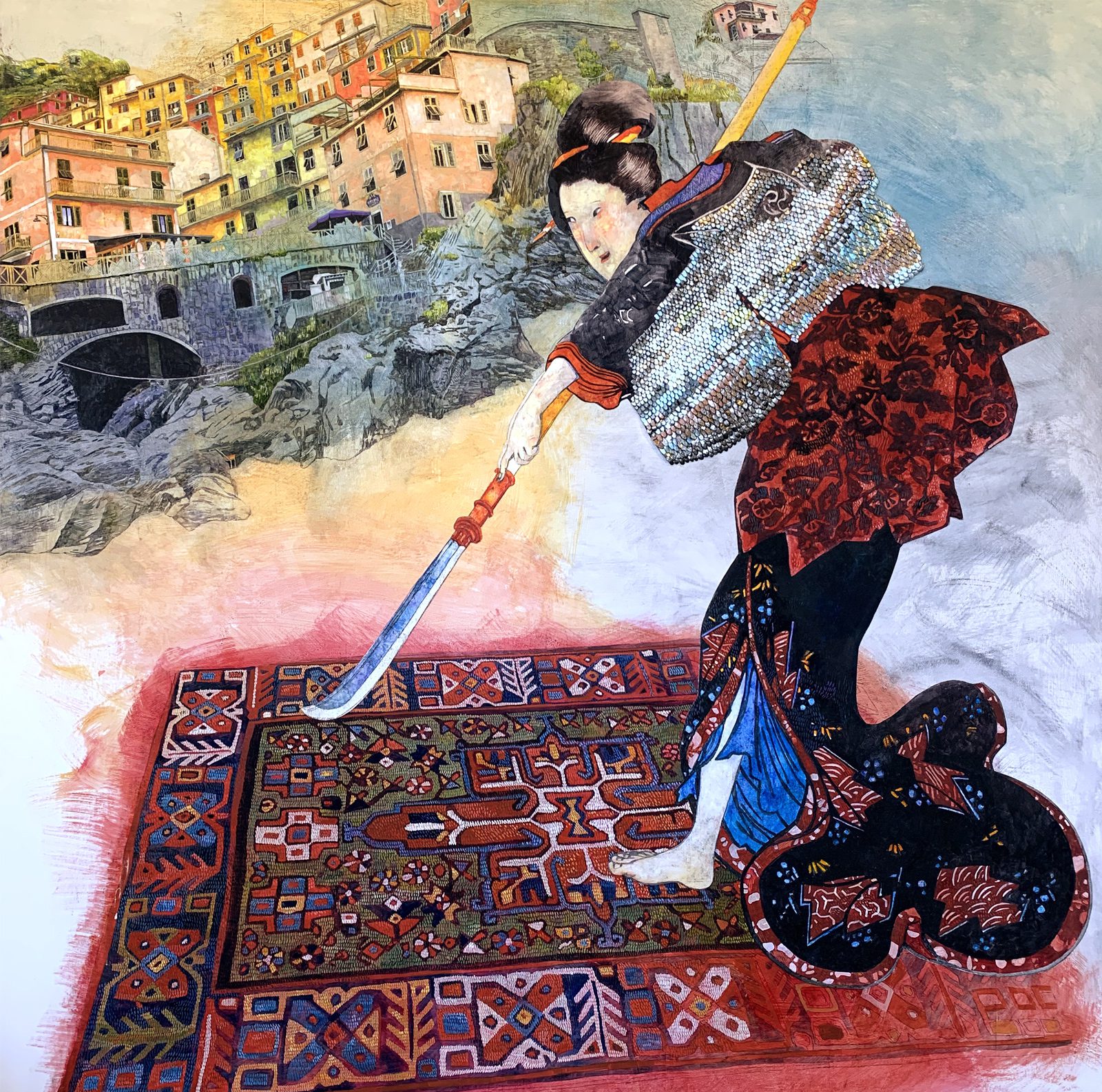 6 x 6 feet, charcoal, oil, and silver-gilded canvas (3D scales) on canvas